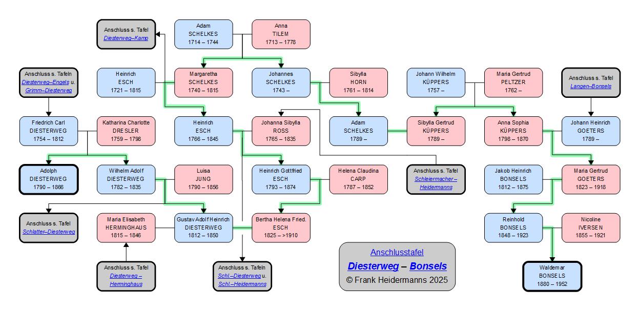 Adolph Diesterweg* 29.10.1790 Siegen ≈ 05.11.1790 Siegen ∞ 01.1814 Hilchenbach-Müsen Johanna Sabine Enslin † 07.07.1866 Berlin | 1790–1866 | Moers, Berlin | Pädagoge, Schulreformator | Diesterweg–Bonsels (JPG), Diesterweg–Engels (JPG), Diesterweg–Herminghaus (JPG), Diesterweg–Kamp (JPG), Grimm–Diesterweg (JPG), Schlatter–Diesterweg (JPG), Schleiermacher–Diesterweg (JPG) |