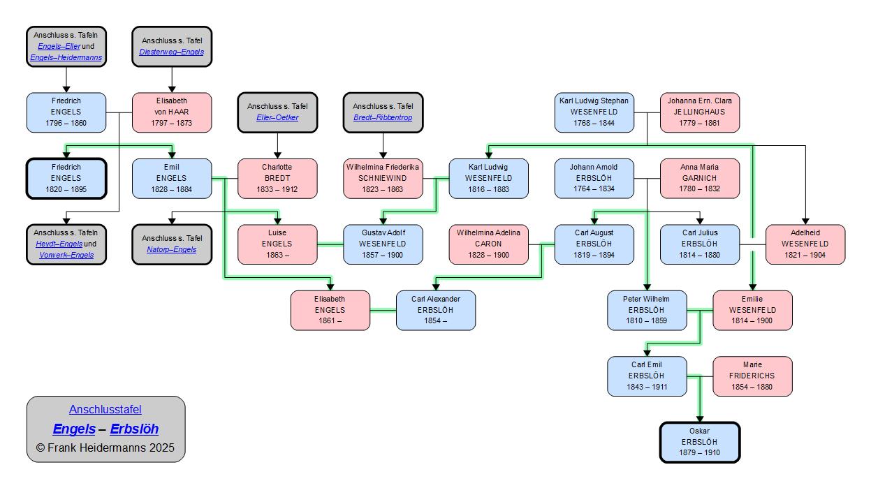 Friedrich Engels* 28.11.1820 Wuppertal-Barmen ∞ 11.09.1878 Manchester, England Lizzy Burns † 06.08.1895 London, England | 1820–1895 | Wuppertal | Kaufmann, Schriftsteller | Benzenberg–Engels (JPG), Diesterweg–Engels (JPG), Duncker–Engels I (JPG), Duncker–Engels II (JPG), Engels–Eller (JPG), Engels–Erbslöh (JPG), Engels–Heidermanns (JPG), Engels–Herminghaus (JPG), Engels–Steinbeck (JPG), Haniel–Engels (JPG), Heydt–Engels (JPG), Humboldt–Engels (JPG), Kinkel–Engels (JPG), Marx–Engels (JPG), Natorp–Engels (JPG), Vorwerk–Engels (JPG) |