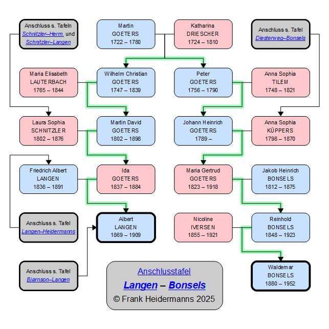 Die folgende Tabelle verweist in der rechten Spalte auf Anschlusstafeln, die die Anbindung der Prominenten untereinander sowie an den Hauptstamm grafisch darstellen. Vielfach empfehlen sich andere Prominente als Bezugspunkt (z. B. Goethe); in solchen Fällen stellen deren eigene Anschlusstafeln (z. B. Goethe–Heidermanns) die Verbindung zu meiner Familie her. Alle Personen und Daten der Tafeln können in der Datenbank nachgeschlagen werden.