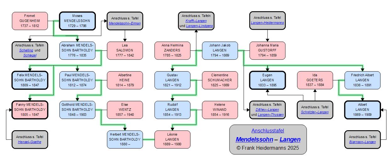 Felix Mendelssohn Bartholdy* 03.02.1809 Hamburg ∞ 28.03.1837 Frankfurt/Main Cécile Charlotte Sophie Jeanrenaud † 04.11.1847 Leipzig | 1809–1847 | Berlin, Leipzig | Komponist | Mendelssohn–Erman (JPG), Mendelssohn–Goethe (JPG), Mendelssohn–Heidermanns (JPG), Mendelssohn–Lange (JPG), Mendelssohn–Langen (JPG), Mozart–Weber–Mendelssohn (JPG), Schelling–Mendelssohn (JPG), Schlegel–Mendelssohn (JPG) |